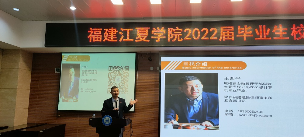 2021年12月13日下午,统战部诚邀我校校外辅导员、2001级校友、福建通民律师事务所支部书记王四平在教学楼4C103教室开展主题为《毕业生防止“被犯罪”》的菁英讲座。此次菁英讲座由统战部牵头,全校共100多名毕业生参加。