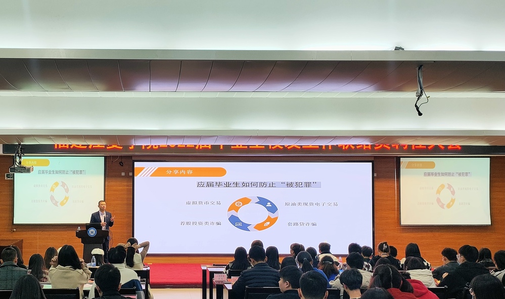 王四平校友以他在工作中接触到的真实案例为切入点,从虚拟货币交易的商业模式开始讲解到上下游交易表现形式;从原油类现货电子交易风险延伸讲解到骗子开发客户所用的“三方二方扮演角色”的骗术;从荐股投资类诈骗到延伸揭秘公司推荐涨停股的骗术;从套路贷诈骗到提醒毕业生求职租房时的各种陷阱,剖析每个案例背后的细节以及带给我们的经验教训,为毕业生带来一场精彩的防金融诈骗的讲座。讲座现场内容饱满、气氛活跃,同学们听了表示受益匪浅,将时刻保持警惕,筑牢思想防线,提高安全意识。
